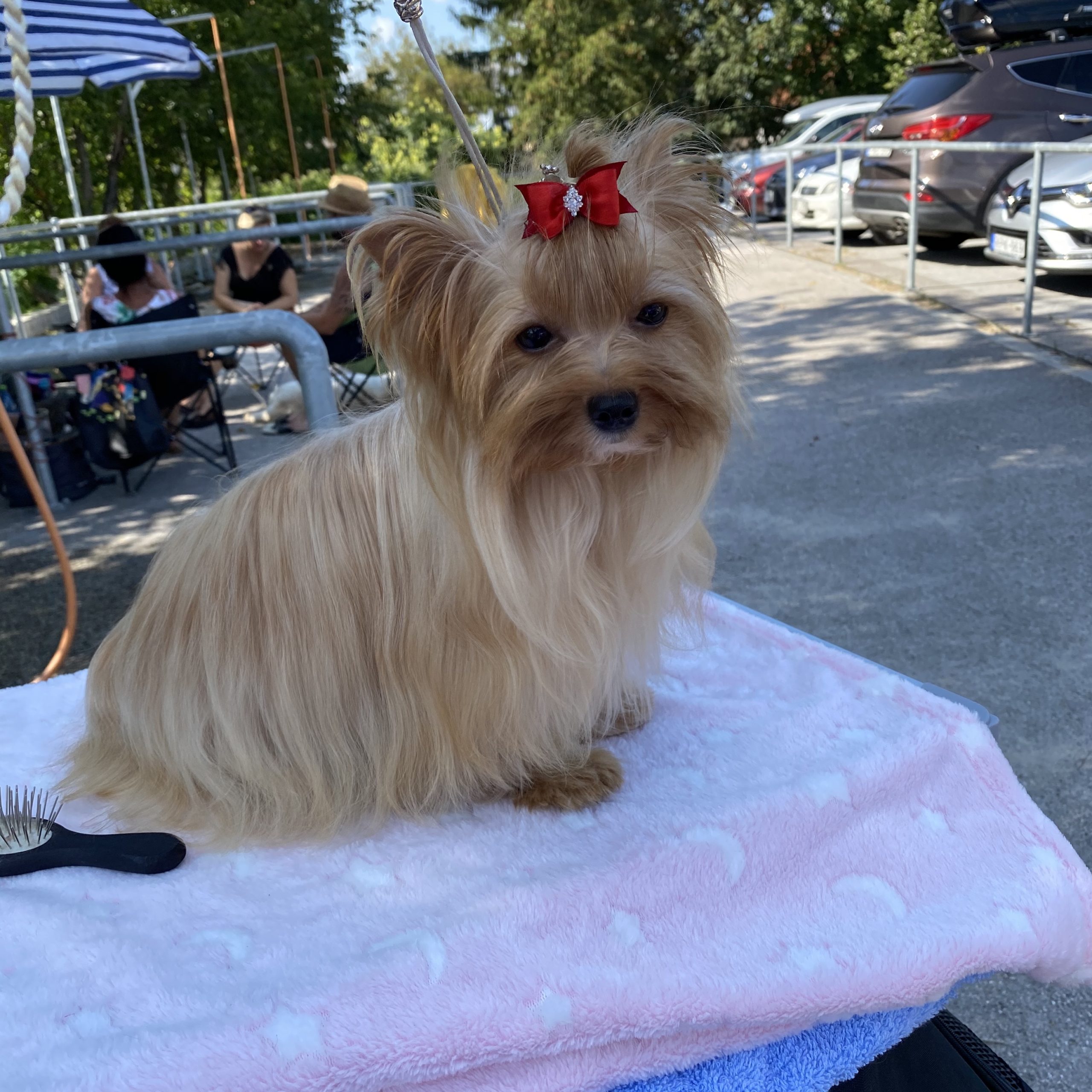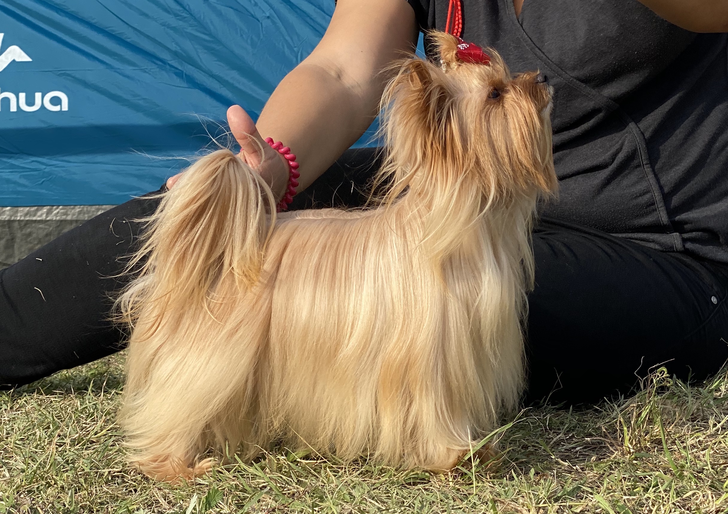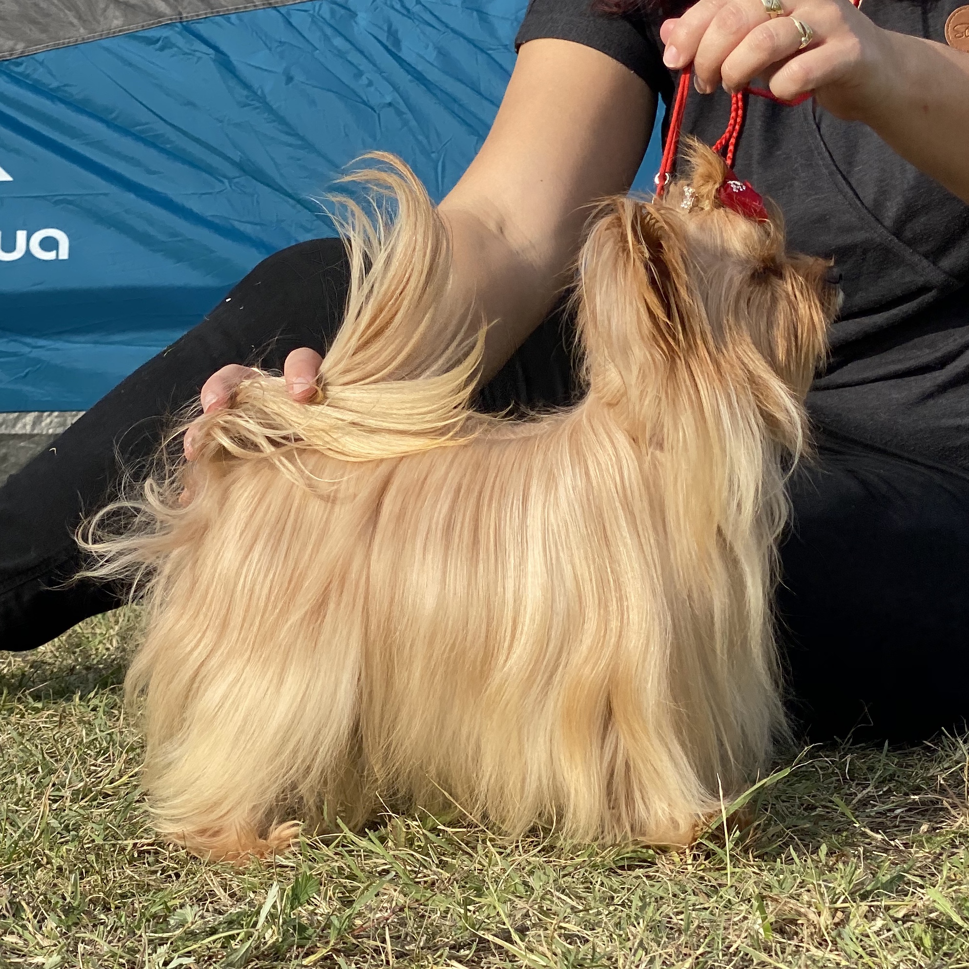 Mindig is szerettem volna Arany yorkikal foglalkozni, de soha nem gondoltam volna, hogy ennyire tüneményesek. Tekila volt az első ilyen színem. Hét hónaposan érkezett Oroszországból. Sokat utazott, de meg sem látszott rajta. Kedves, nagyon barátságos kis kajla kutyus, olyan pörgős, hogy szinte követni sem lehet.